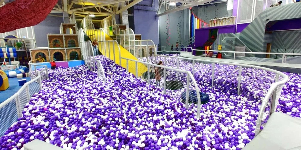 - Детская зона с батутами, горкой, бассейном с шариками, лабиринтом, каруселями и другими развлечениями.